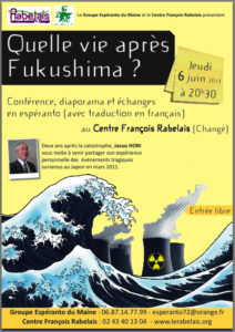 Deux ans après la catastrophe nucléaire de Fukushima, le Groupe espérantiste et le centre Rabelais de Changé (Sarthe) recevaient un resortissant japonais espérantiste : Jasuo Hori. Une invitation à venir partager son expérience personnelle des événements tragiques survenus au Japon en mars 2011. Au travers d’un diaporama et d’échanges avec le public, il a également fait partager aux trop rares participants sa vision de l’avenir de son pays et la question nucléaire.