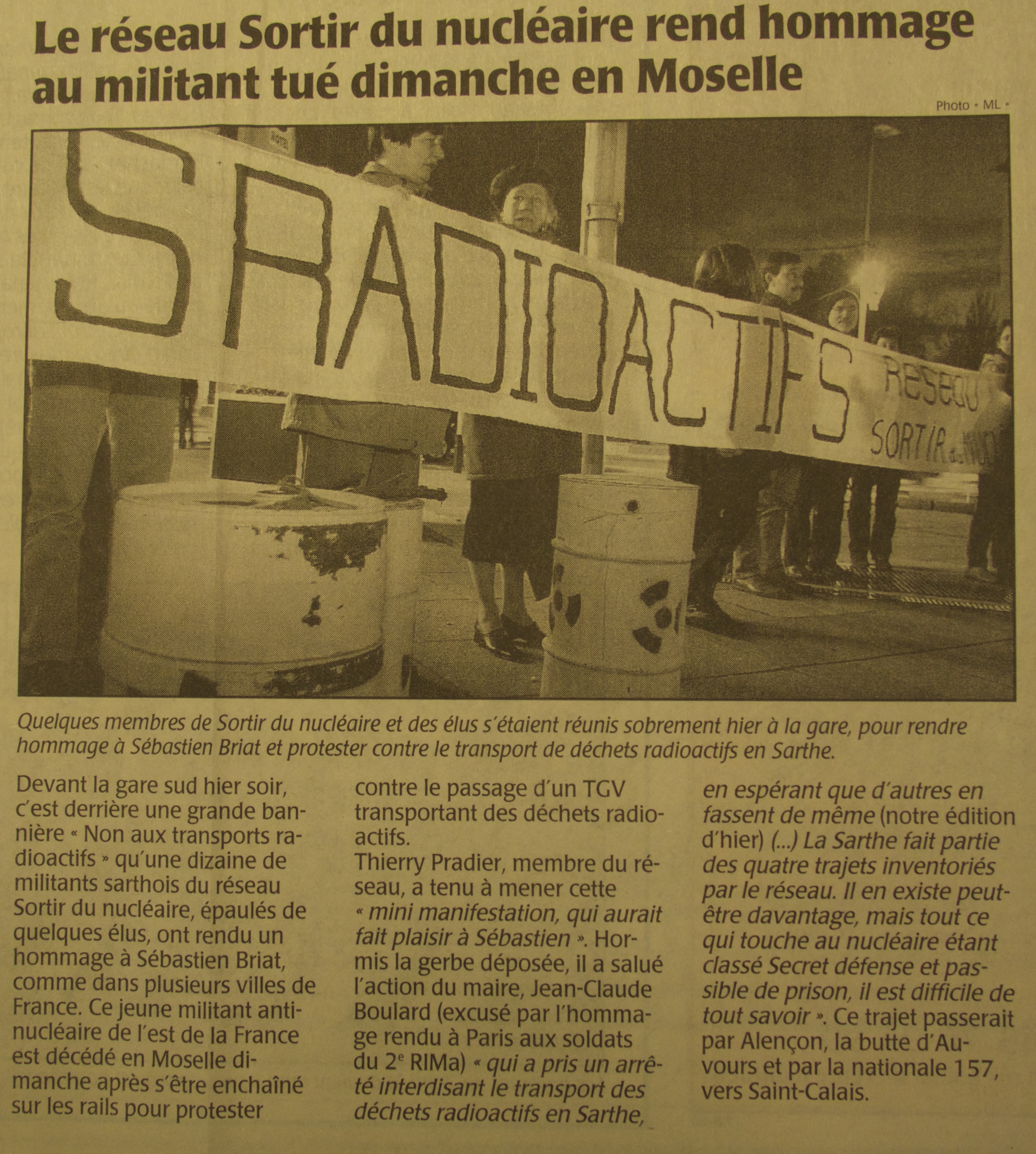 Sortir du Nucléaire appellera à se recueillir en son souvenir le mercredi suivant, devant la gare sud du Mans (cf. coupure de presse de Ouest-France ci-dessous).