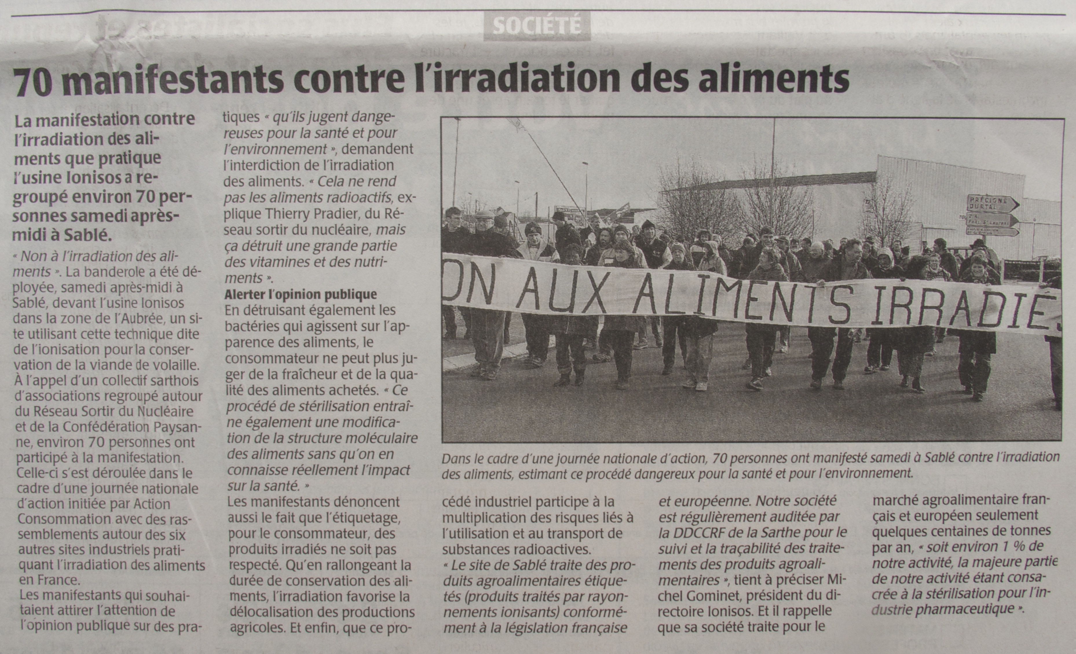 Sablé-sur-Sarthe n’était pas le seul lieu de rassemblement. Six autres étaient concernés (la plupart des sites industriels Ionisos) : Pouzauges (en Vendée), Dagneux (dans l’Ain), Chaumesnil (dans l’Aube), Berric (Morbihan), Marseille (Firme Gammaster), plus un débat à Orsay (dans l’Essonne). Ces manifestations répondaient à « L’Appel national pour l’interdiction de l’irradiation des aliments » que vous retrouverez utilement sur le site national du Réseau sortir du Nucléaire, c’est là : ▶ (et/ou sa revue éponyme n° 26). Un appel signé par : Réseau Sortir du nucléaire, la Confédération paysanne, Attac France, Biocoop, la Criirad, la Fédération Nature et Progrès, Public Citizen, Mouvement pour les droits et le respect des génération futures (MDRGF), Les Amis de la Terre, l’association Léo Lagrange pour la défense des consommateurs et localement par Infovie-Bio, GAB 72, et le CIVAM, Centres d’Initiatives pour Valoriser l’Agriculture et le Milieu rural.