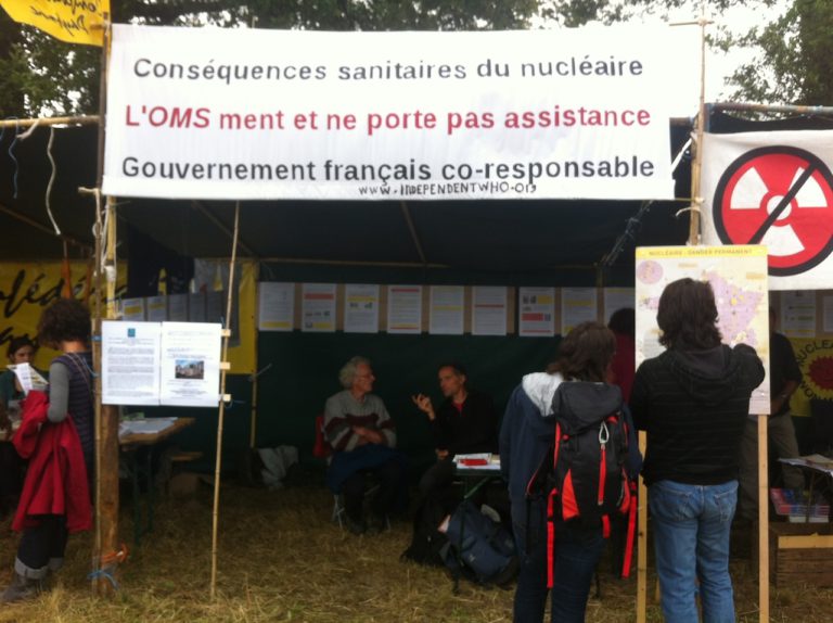 A tribord, sous le calicot « L’OMS ment et ne porte pas assistance », était installée l’association créée en 2006 « Indépendant Who » qui dénonce encore et toujours l’accord de 1959 entre l’AIEA (Agence internationale de l’énergie atomique)