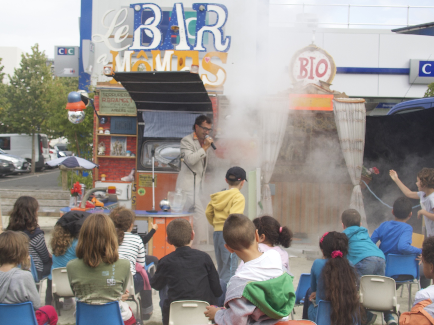 Pas une association (ou alors d’intermittents du spectacle), la Cie Banane-Cerise d’Angers, installée rue Bizet, invitait aussi les plus jeunes dans un lieu de perdition, son « Bar à mômes ». Un étrange bistrot où on ne sert que de l’eau… sèche, non conductible, réhydratable dans un très mystérieux « frigo-ondes nucléaires » ! Une sorte d’athanor où il se passe des choses mystérieuses. Accessoirement, les encombrants parents peuvent aussi être remisés dans un « congélo-ondes nucléaires ». Les résultats de cette alchimie sont explosifs, surprenants, peu ragoûtants, et, au bout du bout, fumeux dans tous les sens du terme (cf. photo). Au passage, les autorités locales, préfète, etc., en prennent gentiment pour leur grade. Ici, on leur prête même d’être parfois « arrosés » par le lobby nucléaire. Histoire de mieux comprendre la parabole, les minots sont gentiment arrosés d’une eau bien liquide cette fois. Rafraîchissant ! Tout au long du spectacle, la marmaille était joyeusement complice et participative ! Quant à savoir si elle perçoit le message subliminal (et pas que) antinucléaire, nous verrons. En tout cas, elle n’est pas encore d’âge d’adhérer massivement à SDN 72 ! D’ici là, informons, agissons pour que l’insouciante jeunesse n’échoue d’aventure chez nos voisins d’en face : Les amis des 4 x 4 72…