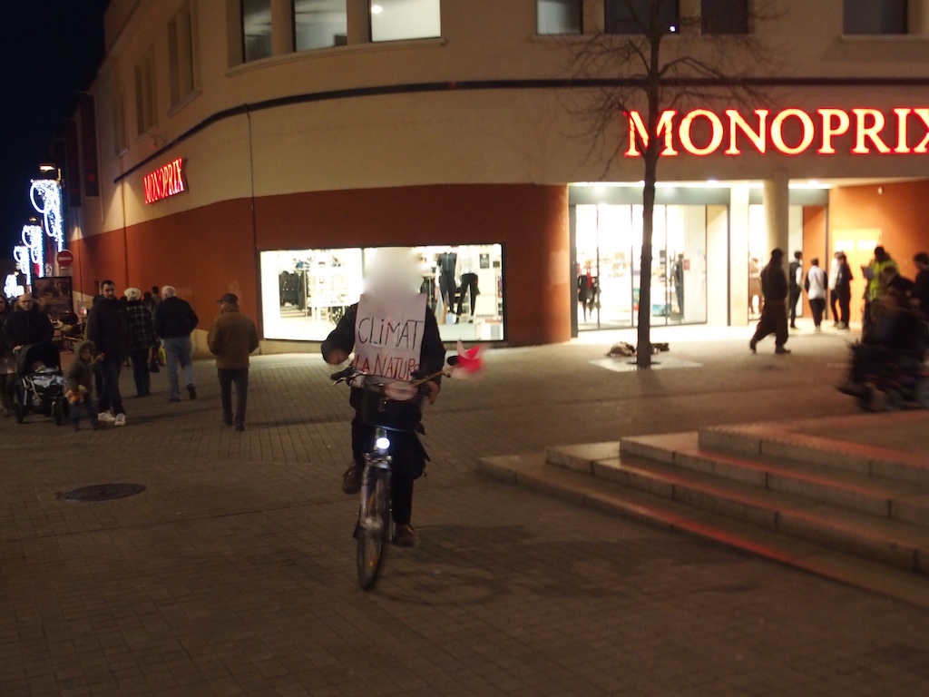 Cop 21 Climarathon "Du coup, l’atelier moulins à vent s’est vu renforcé par des ateliers flambeaux, dossards, panneaux pour cette ubuesque compétition improvisée dans le centre-ville : « course » à pied en relais ou à vélo, avec, pour flambeaux olympiques, de symboliques éoliennes (moulins à vent en cellulose), et, sur le parcours, de nombreux et bruyants supporters installés (ou pas) aux terrasses des cafés Cop 21 Climarathon 3que les autorités, souvenez-vous, recommandaient de réinvestir (rappel : « Je suis Charlie », devenu : « Je suis en terrasse »). Ritournelle des interpellations : « Sauvons le climat, pas le système ! », « Le nucléaire ne sauvera pas le climat ! », « Chauffe la lutte, pas le climat ! »« suites des slogans, contributions souhaitées ».