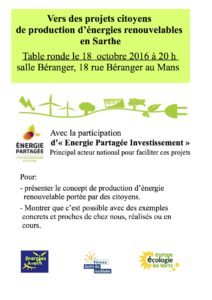 Nous vous convions dans ce but à une réunion d’information sur ce sujet le 18 octobre 2016, à 20 h, salle Béranger au 18 rue Béranger au Mans, Énergie Partagée Investissement, principal acteur national pour faciliter ces projet, présentera le concept de production d’énergie renouvelable portée par des citoyens des témoignages de groupes de citoyen ayant mis en place de tels projets sont prévus.