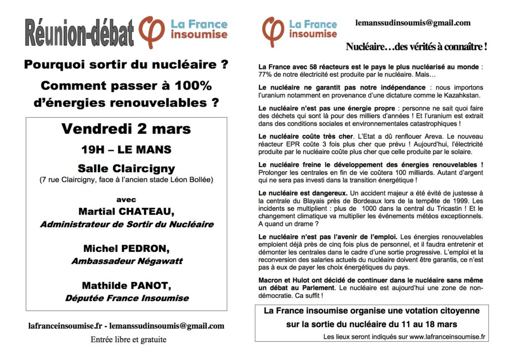 La FI départementale participera aussi au grand rassemblement pour la sortie du nucléaire à Paris, place de la République, le 11 mars 2018, dès 14 heures, à l’appel de : Réseau Sortir du nucléaire, Yosomono, Sortir du nucléaire Paris,