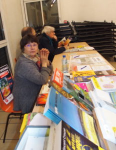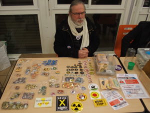Invité, le groupe SdN 72 y avait une confortable place, avec un intervenant de ses rangs, ses visuels de communication (carte infographique, banderoles) et une table de presse en fond de salle (photo). Un espace que nous partagions avec Attac, Les amis et riverains de Bener, la FI évidemment et l’étal du « philopinesque » producteur d’épinglettes militantes (large gamme de pin’s antinucléaires, mais pas que) et… caustique « épingleur » de tout un chacun (surtout les politiques, quand même) à plein temps (photo).