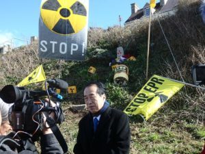 Visite en extérieur de l’usine de retraitement de La Hague en présence de André Guillemette, de l’ACRO, qui indique les différents lieux de rejets de déchets radioactifs autour de l’usine. Au cours de cette visite, Naoto Kan s’est exprimé sur les 20 tonnes de plutonium (Pu) d’origine japonaise (issu du retraitement de combustibles usagés japonais retraités à La Hague il y a quelques années). La loi française exige que ce Pu retourne au Japon, Naoto Kan ne souhaite pas son retour en l’état en raison du risque de prolifération. Il suggère de faire comme aux USA avec les surplus de Pu militaire, le remélanger avec un produit neutre empêchant le risque d’atteindre la masse critique permettant une réaction nucléaire avant tout retour au Japon.