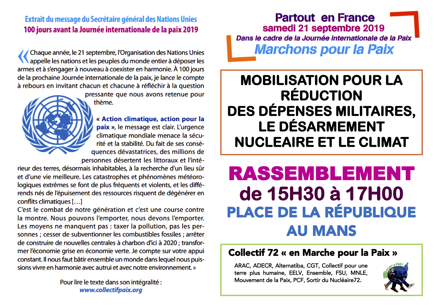 Le collectif 72 « En marche pour la paix » proposait également un rendez-vous le lendemain, à 17 heures, place de la République au Mans, pour la Journée internationale pour la paix et le climat, et des convergences avec les ramarcheurs de la journée mondiale World clean-up day opérant sur la ville du Mans mais aussi à la périphérie, Saint-Georges-du-Bois, etc.