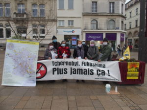 De 15 heures à 17 heures, ce mercredi 10 mars, une douzaine de militant·e·s du groupe Sortir du nucléaire 72 ont rappelé aux passants (de la place de la République du Mans et de la rue des Minimes) qui voulaient bien l’entendre — voire en discuter pour certain·e·s — la terrible déconvenue d’un pays reconnu hautement technicisé, maîtrisant la sécurisation contre les risques tectoniques [2], capable d’entraver de puissantes vagues de submersion et tant d’autres prouesses qu’on ne pourrait le prendre à défaut, tel son minable voisin soviétique (à l’époque) qui, lui, s’était oublié à Tchernobyl un certain 26 avril 1986.