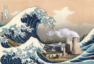 Photos : SdN 72. Illustration : tableau de 1831 de Katsushika Hokusai, détourné. La reprise du très célèbre et populaire tableau intitulé « La Grande Vague de Kanagawa » est une vue d’artiste très occidentale. Les tours de refroidissement des centrales nippones (de très hautes cheminées verticales) ne ressemblent en rien aux nôtres. Et les centrales de bord de mer sont d’abord refroidies par l’eau de mer.