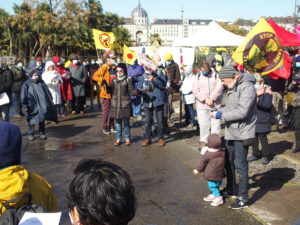 Malgré le froid, la pluie, le vent, l’esprit enjoué, convivial et paladin des participant·e·s a permis de surmonter les affres de la météo. Et l’ambiance est restée de mise grâce aux musiciens, aux chants repris en groupe, au dynamisme folâtre de l’école de samba, sans compter la fantaisie des pancartes des uns et des autres et les impromptus sur l’enfouissement des déchets nucléaire, l’eau (douce, de mer, de consommation) « enrichie » au tritium (cf. photos et vidéo)… Autant de moments intenses que vous pourrez découvrir ou redécouvrir sur la courte captation vidéo (durée : moins de cinq minutes) de cet événement par François Nicolas, c’est là : ▶.