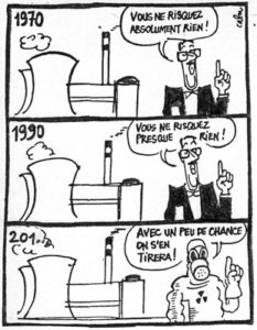 Juste une réserve : la démonstration de Th. Gadault nous a parfois semblé — à nous aussi — « trop déterministe dans sa certitude que le nucléaire est dans une impasse climatique, technique, économique et financière » à laquelle il ne survivra pas. L’industrie nucléaire mondiale a probablement atteint un seuil qu’elle ne reverra jamais. La singularité du pays le plus nucléarisé au monde (par habitant) est effectivement vacillante sous de multiples aspects et constatable par tous. Le Made in France — Concorde, Minitel… et maintenant l’énergie — a indubitablement perdu de sa superbe, mais le modèle reste et promet, si l’on en juge par les programmes présidentiels, de perdurer. Alors que de nombreuses forces politiques promettent de relancer la machine pour « perpète », le « grand cadavre à la renverse » (J.-P. Sartre) sombrera-t-il corps et biens au fond du gouffre sans qu’un fort mouvement populaire de ses clients-usagers ne l’y précipite ou qu’un accident majeur ne survienne ? L’avenir n’est pas encore écrit.