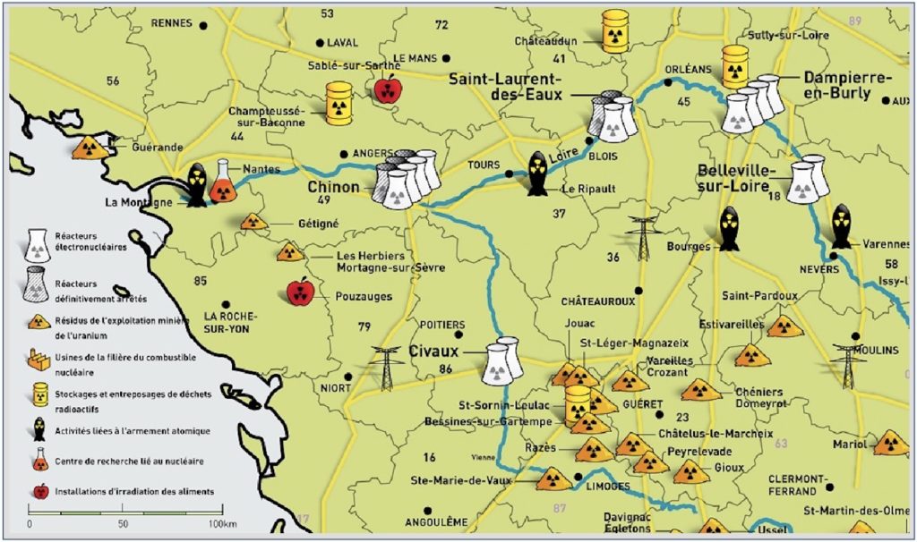 - Atteintes environnementales liées au fonctionnement des dix-neuf réacteurs nucléaires (14 en fonctionnement, 5 à l’arrêt à Saint-Laurent-Nouan et Chinon, non encore démantelés)