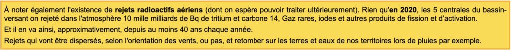 Mais il est un domaine que les Françaises et les Français ignorent la plupart du temps : le fait que les centrales nucléaires rejettent continuellement et en quantités importantes des éléments radioactifs et des produits chimiques dans l’air ainsi que dans les fleuves, rivières et mers qui permettent leur refroidissement (tout en les réchauffant !).