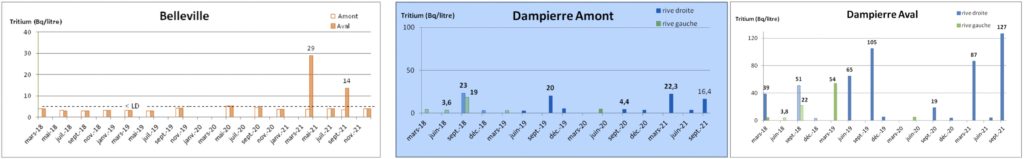 - Voici deux exemples : nos mesures à Belleville (Cher), première centrale au fil de l’eau : pas de tritium décelé en amont… et nos mesures à Dampierre (Loiret) : présence de tritium en amont de la centrale et, bien sûr, encore plus de tritium en aval.