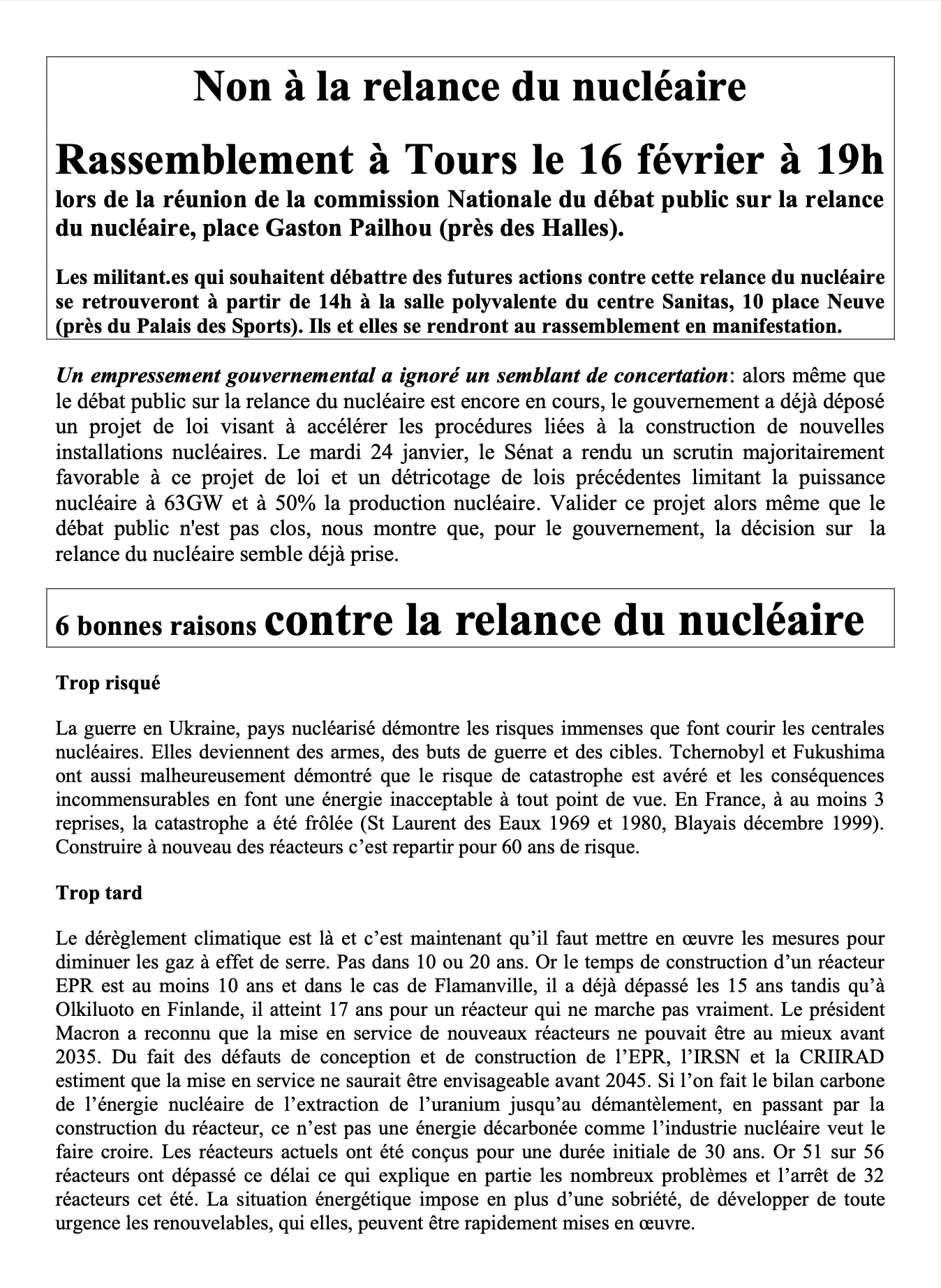 Que nous soyons d’ancienne ou de jeune génération, membres de réseaux, d’organisations nationales ou de collectifs locaux, et quelles que soient nos moyens d’action respectifs, retrouvons-nous le 16 février 2023 à 17 heures, à Tours, pour dire haut et fort, ensemble, notre opposition à la relance du nucléaire.