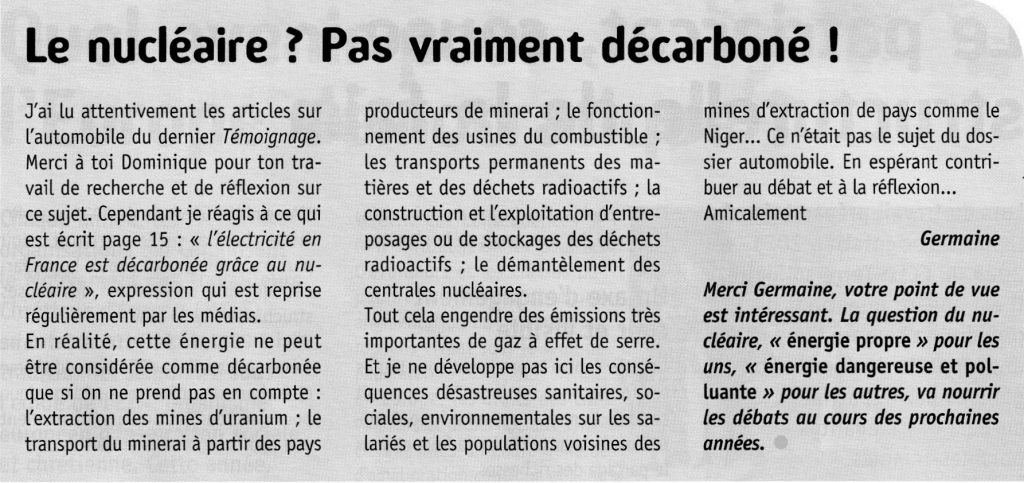 Ce n’est pas en répétant un mensonge qu’il devient une vérité. Présenter en boucle le nucléaire comme une énergie « propre » parce que « décarbonée » nous y mène pourtant tout droit. Il nous revient de rétablir les vérités factuelles sur cette filière aussi souvent qu’il nous est possible de le faire, sans se lasser. Occasionnellement, des médias offrent leur colonnes à leurs lecteurs rangés à nos arguments (courrier des lecteurs pour Ouest-France, blog pour le Blog de Médiapart…). Germaine — militante SdN 72 — a dernièrement expérimenté cette opportunité en déconstruisant l’argument dit d’une « énergie nucléaire décarbonée » avancé dans le dossier intitulé « Quel avenir pour l’industrie automobile » (pages 13 à 20), coécrit par Dominique Rousseau, de la CFDT Renault Le Mans, sur l’avenir de l’automobile paru dans le journal « Témoignage » de l’Action catholique ouvrière (ACO) n° 610 d’octobre 2023, c’est là : . La phrase incriminée est au paragraphe : Faire plus pour sortir du pétrole et du tout-électrique de la page 15 : … «  En France, les alternatives à l’électrique ont peu d’écho. L’électricité en France est décarbonée grâce au nucléaire. Malgré l’addition d’énergies renouvelables, cela ne suffit pas à répondre au besoin d’électricité, notamment l’hiver » …