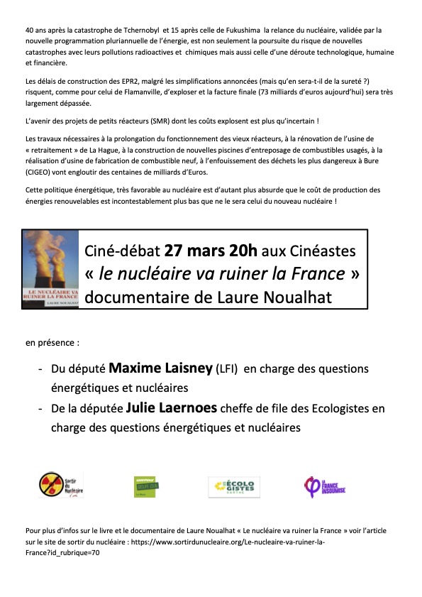 Vend. 27 mars 2026, à 20 h : ciné-débat — Le nucléaire va ruiner la France ! aux Cinéastes. Intervenants : Maxime Laisney (LFI) et Julie Laernoes (les Ecologistes)