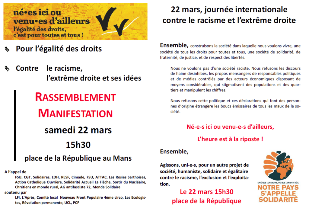 22 mars : à 15 h 30 (à 11, place de la Libération à La Flèche) rassemblement, manifestation Pour l’égalité des droits, contre le racisme, l’extrême droite et ses idées