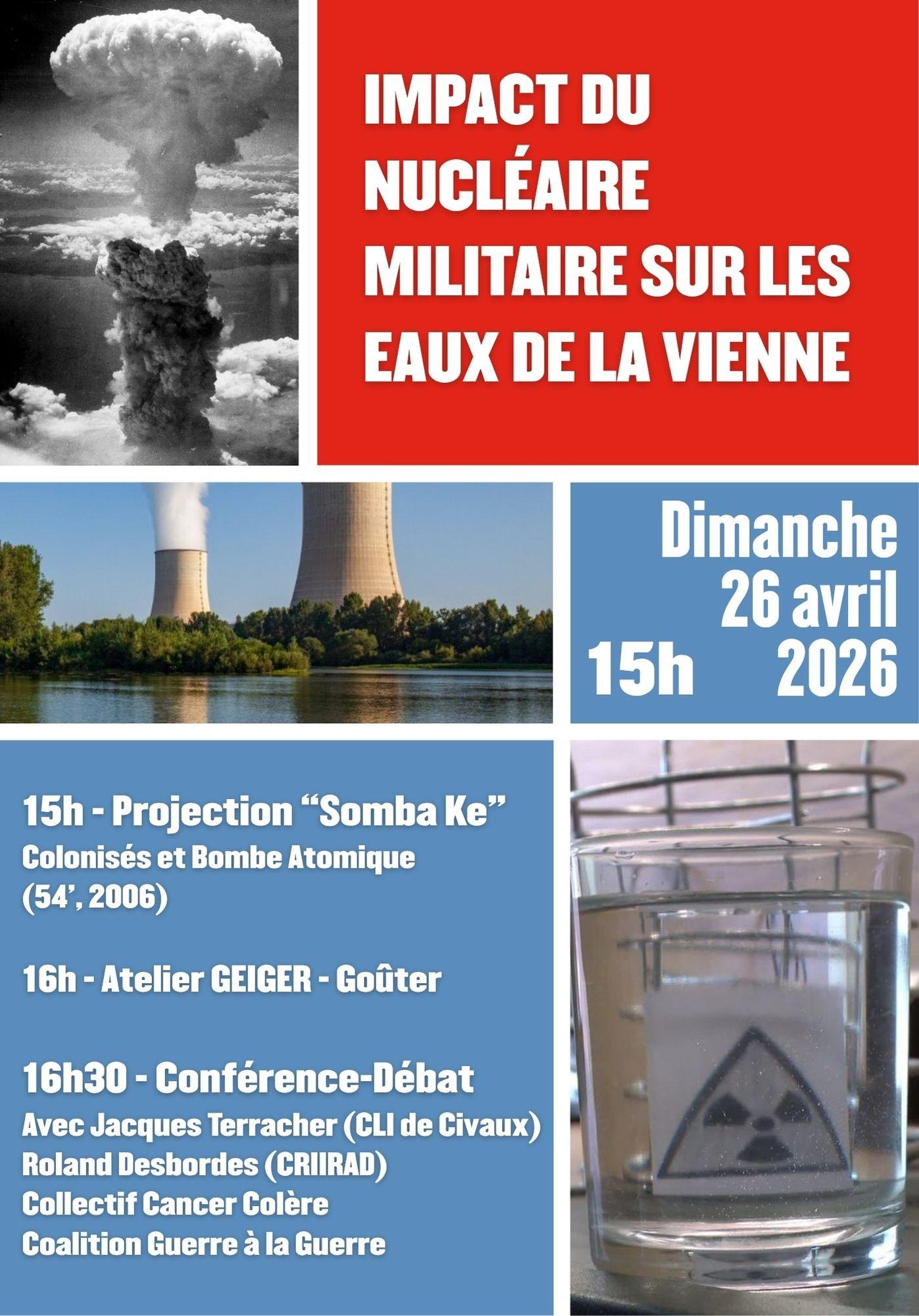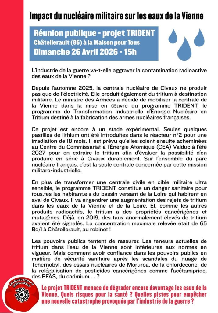 16 avril 2026 par « Tous les Évènements 26/ 4/2026 Châtellerault (86) : Impact du nucléaire militaire sur les eaux de la Vienne avril 26 à 15 h 00 min - 20 h 00 min « Prochaine réunion SdN 72 : jeudi 9 avril 2026, à 17 h Prochaine réunion SdN 72 : mardi 2 juin 2026, à 17 h » Dimanche après-midi 26 avril 2026 — Châtellerault , à la Maison pour tous, à partir de 15 h Ajouter au calendrier Google Agenda iCalendar Outlook 365 Outlook Live Détails Date : avril 26 Heure : 15 h 00 min - 20 h 00 min