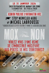 Retrouvez Stop Newcleo Aube pour une conférence avec Michel Labrousse (ingénieur spécialiste des petits réacteurs et membre de l’association Global Chance) à la salle polyvalente de Marnay-sur-Seine de 17 h 30 à 19 h 30 le samedi 31 janvier 2026. Michel Labrousse, scientifique sera présent pour nous parler des impacts irréversibles de ce que Newcleo veut nous imposer !