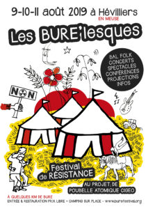 Le troisième festival de résistance à l’injustifiable projet de poubelle atomique CIGéo (Centre industriel de stockage géologique) se tiendra cette année à Hévilliers dans la Meuse (à quelques kilomètres de Bure, entre les communes de Hévilliers et Couvertpuis, sur la D31) les 9, 10 er 11 août 2019.