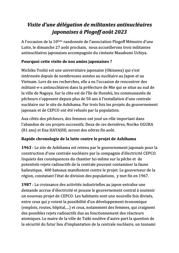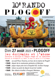 Dimanche 27 août aura lieu la 10 ème édition de la randonnée co-organisée par Plogoff Mémoire d’une lutte et Sortir du nucléaire Cornouaille. Des personnes venues du Japon, du Pays de Galles et d’Allemagne seront présentes. La ballade dans ce site préservé de Plogoff sera ponctué de lectures d’écrivains sur l’atome accompagnés de moments musicaux.