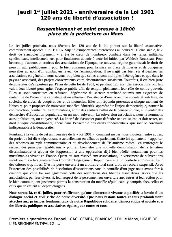 Les autres signataires : AFALAC, AFPS72, ARAC, Association Sarthoise des Amies et Amis de la Commune de Paris 1871, Associations laïque du Pays Fertois, ATTAC, CAC,  CEMEA, CHROMA, Collectif Sarthois Pour Une Terre Plus Humaine, DDEN, Eucalyptus, La CIMADE, Les FRANCAS, LIGUE DE L’ENSEIGNEMENT/FAL72, Ligue des Droits de l’Homme, MNLE72, OCCE, Sortir Du Nucléaire72, …