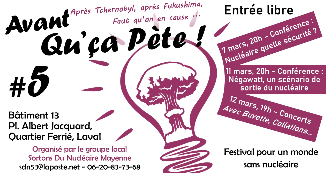 Le groupe local Sortons du Nucléaire Mayenne organise son cinquième festival Avant qu’ça pète ! (festival pour un monde sans nucléaire) les lundi 7, vendredi 11 et samedi 12 mars. En plus d’y aller, en voici l’affiche, à diffuser sans modération.