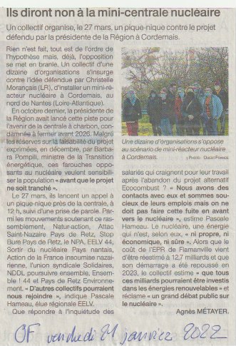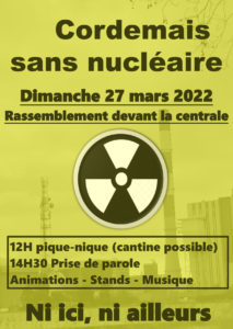 Retenez bien ce rendez-vous ! Un collectif d’associations et d’organisations qui ne manquera pas de s’élargir dans les semaines à venir organise un pique-nique à Cordemais (entre Nantes et Saint-Nazaire) en Loire Atlantique, le dimanche 27 mars 2022, pour protester contre les velléités de la présidente de Région — Christelle Morançais — et avec elle d’innombrables politiques, partis, industriels, financiers… de substituer un SMR, Small modular reactor (une mini centrale nucléaire) en lieu et place de l’ancienne centrale au charbon de Cordemais.