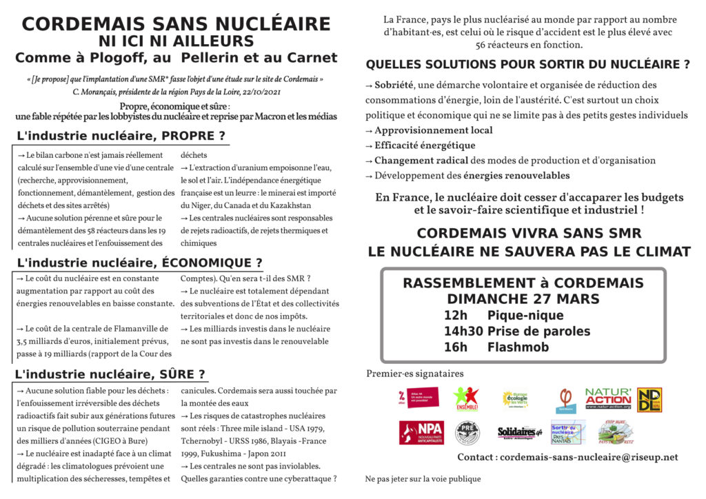 Retenez bien ce rendez-vous ! Un collectif d’associations et d’organisations qui ne manquera pas de s’élargir dans les semaines à venir organise un pique-nique à Cordemais (entre Nantes et Saint-Nazaire) en Loire Atlantique, le dimanche 27 mars 2022, pour protester contre les velléités de la présidente de Région — Christelle Morançais — et avec elle d’innombrables politiques, partis, industriels, financiers… de substituer un SMR, Small modular reactor (une mini centrale nucléaire) en lieu et place de l’ancienne centrale au charbon de Cordemais.