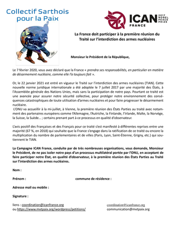 Le jeudi 24 février 2022, à la suite de la projection du film « Le début de la fin des armes nucléaires » (présentation infra) le Collectif 72 pour la Paix vous propose d’en débattre avec un intervenant co-négociateur (parmi de des nombreux·ses autres) du TIAN, Traité d’interdiction des armes nucléaires qui a valu à ICAN, Campaign to Abolish Nuclear Weapons pour son action, le prix Nobel de la paix 2017. L’entrée est gratuite, un large temps d’échanges interactifs avec les personnes du public est prévu.