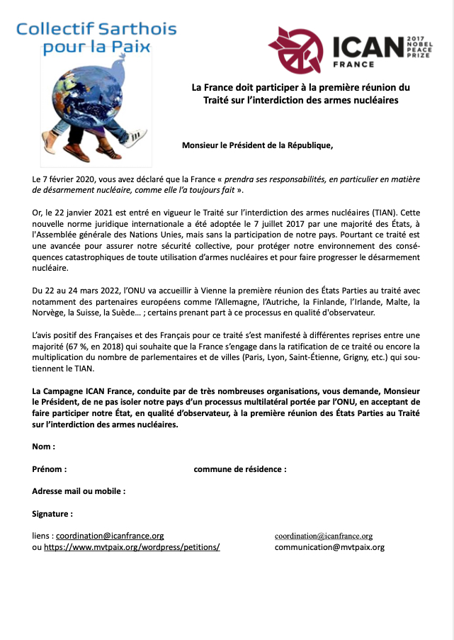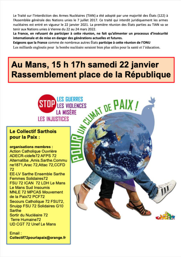 La France — doit — participer à la première réunion du Traité sur l’interdiction des armes nucléaires ! La politique de la chaise vide ne semble pas opportune quand il s’agit de traiter de l’abolition des armes nucléaires, voire de l’avenir de l’humanité. Le développement de cet axiome est ci-dessous. Merci de le lire, le partager et de l’exprimer samedi après-midi 22 janvier de 15 à 17 h place de la République au Mans.