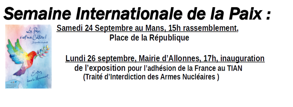 Rassemblement sam. 24 sept. au Mans, à 15 h, pl. de la Rép’ : semaine Internationale de la Paix