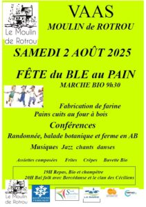SdN 72 sera cette année encore de la Fête du blé au pain à Vaas, sa 23e édition (les éditions 2020 et 2021 avaient été annulées par les raisons que vous savez : la Covid 19), au moulin de Rotrou/Robert, le samedi 2 août 2025, toute la journée ! Depuis de nombreuses années maintenant nous y sommes invité et présent avec un stand info-kiosque bourré d’informations, de documentations, pour vous y rencontrer, vous écouter et échanger, envisager des possibilités d’interventions… autour de notre table de presse.