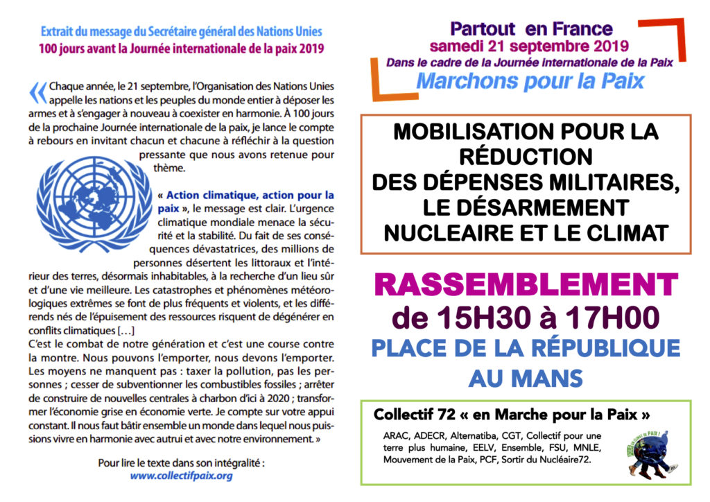 C’est une journée avec de fortes convergences d’actions pour la paix, contre la nouvelle course aux armements, pour le climat, la défense de l’environnement et de la biodiversité. Le tout en convergences avec la marche des jeunes du vendredi matin et le discours du Secrétaire Général de l’ONU.