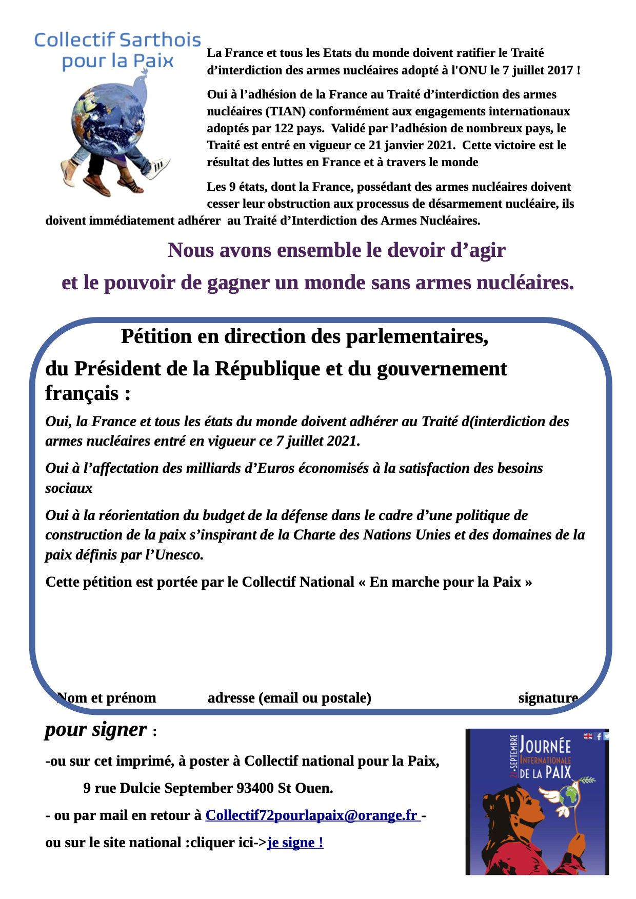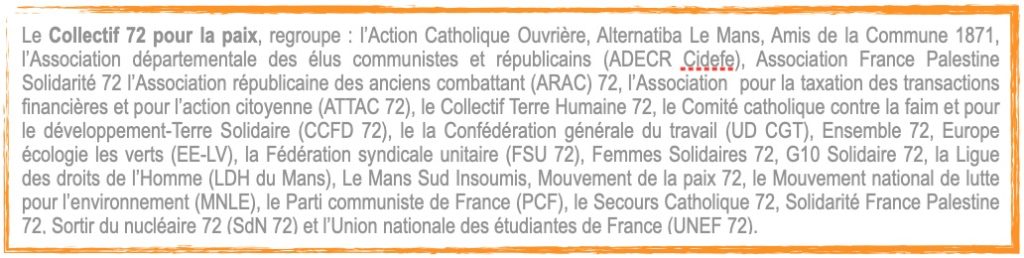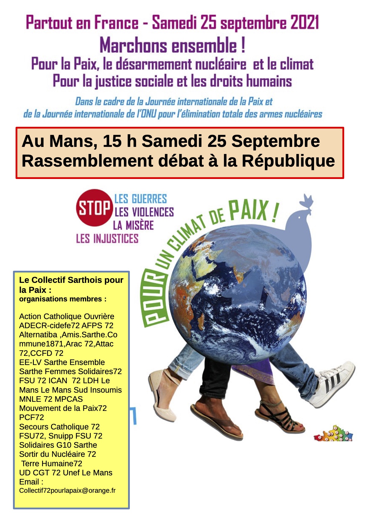 À l’occasion de la » Journée internationale de la Paix » (officiellement le 21 septembre) et de la Journée Internationale de l’ONU pour l’élimination totale des armes nucléaires, le Collectif pour la Paix de la Sarthe appelle à un rassemblement-débat le samedi 25 septembre à partir de 15 h, place de la République au Mans (seul lieu de fixation).