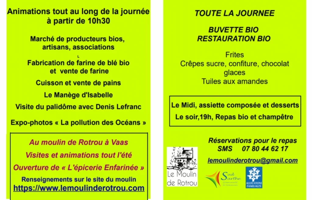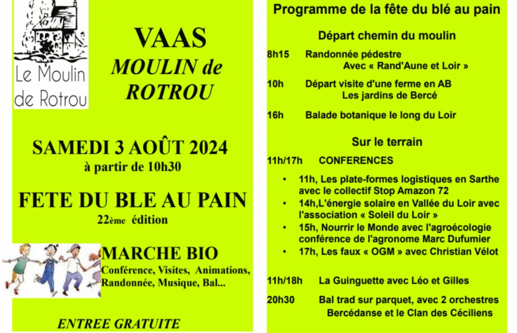SdN 72 sera cette année encore de la Fête du blé au pain à Vaas 22e édition (les éditions 2020 et 2021 avaient été annulés par les raisons que vous savez : la Covid 19), au moulin de Rotrou/Robert, le samedi 3 août 2024, toute la journée ! Depuis de nombreuses années maintenant nous y sommes invité et présent avec un stand info-kiosque bourré d’informations, de documentations, pour vous y rencontrer, vous écouter et échanger, envisager des possibilités d’interventions… autour de notre table de presse.